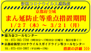 新型コロナウイルスの新規感染者増加が続いているため、京都府全域での「まん延防止等重点措置」期間が3月21日まで再延長されました。