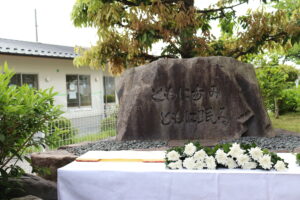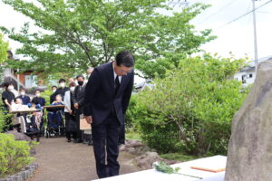 今年度はご遺族皆様にも参列いただき、病棟からも入所者の方と職員が献花を、慰霊碑前で理事長、所長はじめ法人並びにセンター幹部職員と共に、故人に対する追悼の意をささげ、皆様のご健康を祈念させていただきました。
